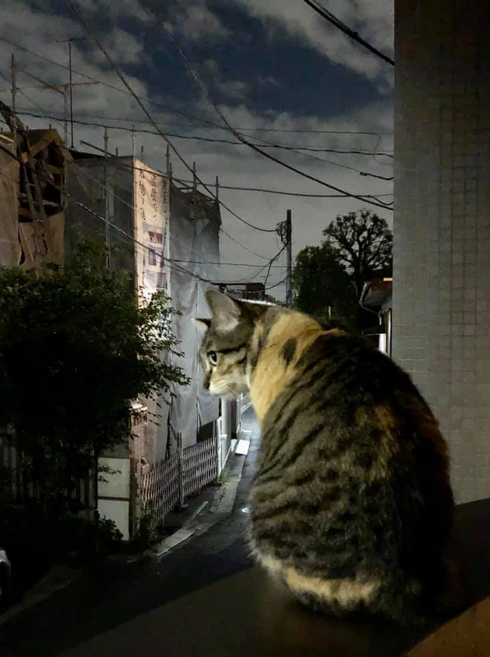 ミーちゃんのミッションはミハリ。 ベランダの柵の上から、毎日、町内を見張っている。 電線にとまるスズメ、散歩中の犬、スマホ歩きの人間たち、工事の進捗状態、etc. 夜も見張りを欠かさない。立派だ!