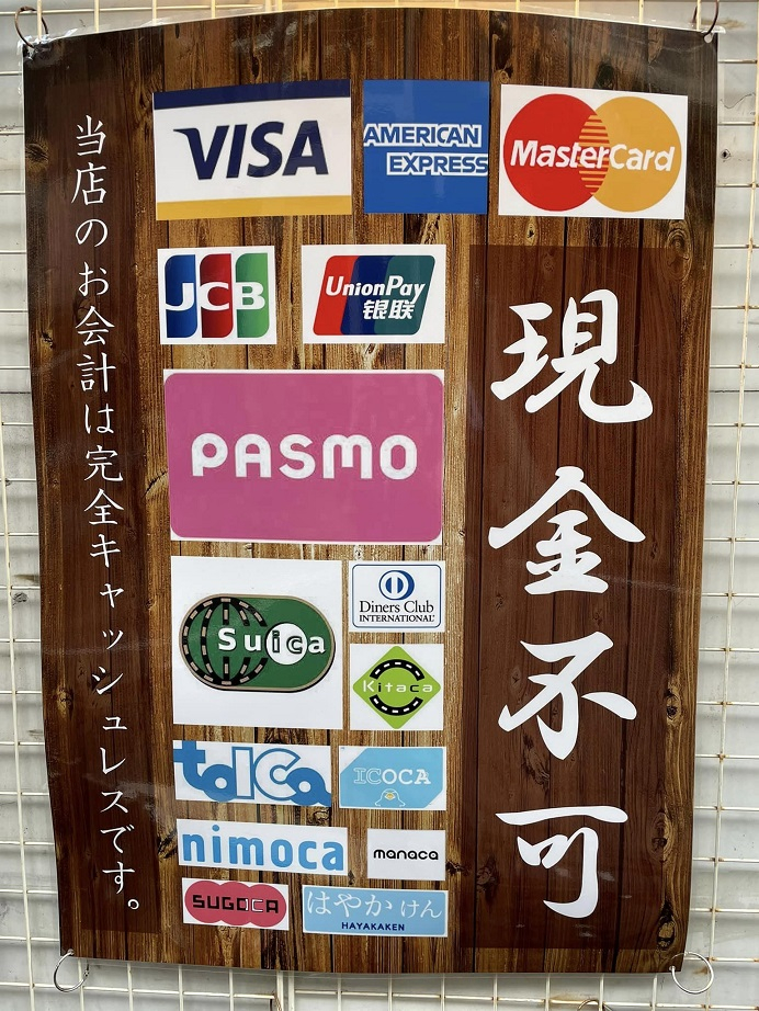 最近はPayPayやSUICAやカードで支払うことが多く、あまり現金を持ち歩かなくなった。 ところが、春にスキーに行った時、レストランもリフト券もレンタルショップもスクールも現金しか使えず、貧しいバカンスになってしまった。 3日目は、ついに2家族の所持金を全部合わせても千円! 売店でパンを買ってちぎって分けて、ひもじいランチをした。 現金は大事だよね。ところが、こないだ、こんな店を見つけた。 現金不可なんだって。それもな〜。