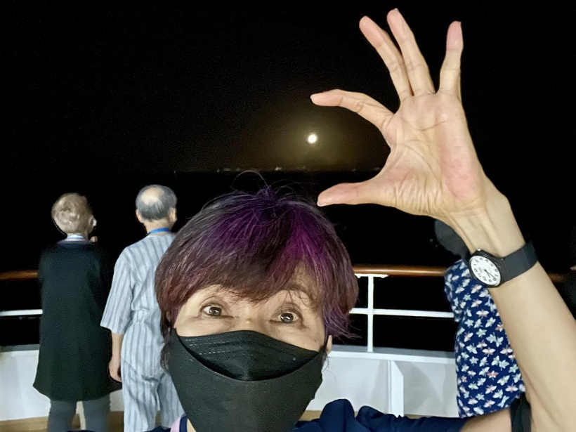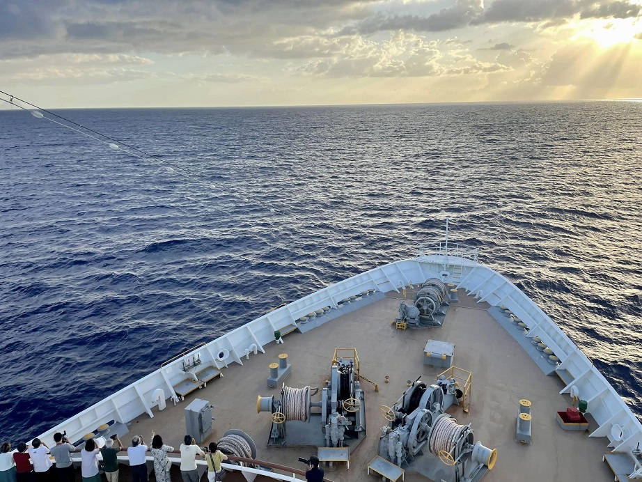 夕暮れ、操舵室から放送があり、クジラの潮吹きが見えるとのこと、秒速で船首にダッシュ。