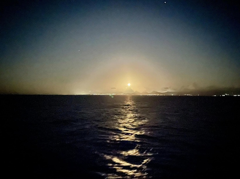 そして日が沈み、月が遠くモーリシャスの山頂から上がった。