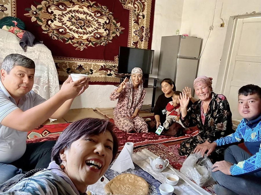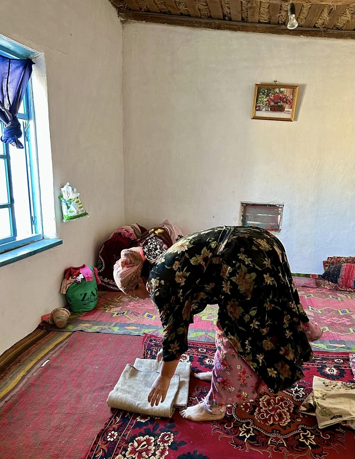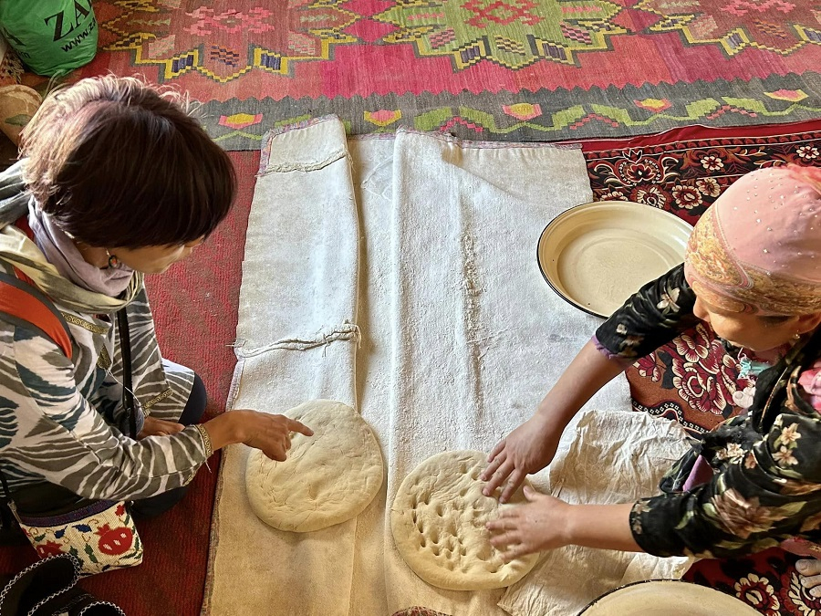 ユルタキャンプからラクダに揺られて着いたドンガラック村で、これから伝統的なパン「ノン」作り体験だ。