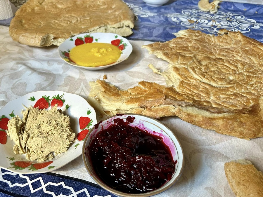 ビーツのジャム、ひまわりの種の甘いペースト、手作りバター、テーブル代わりの布に、どんどん出てきた。