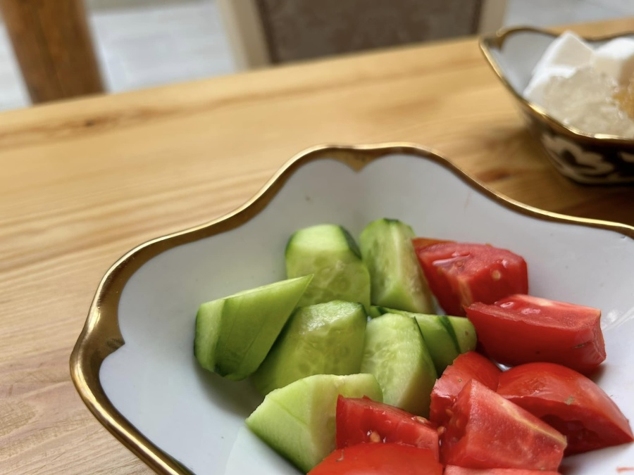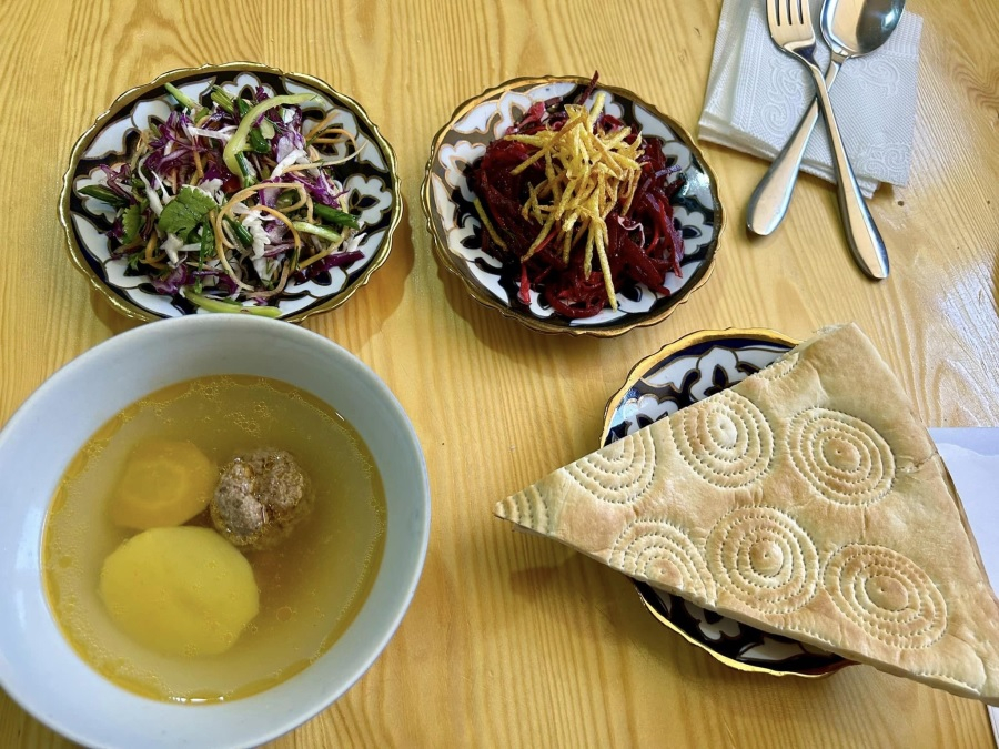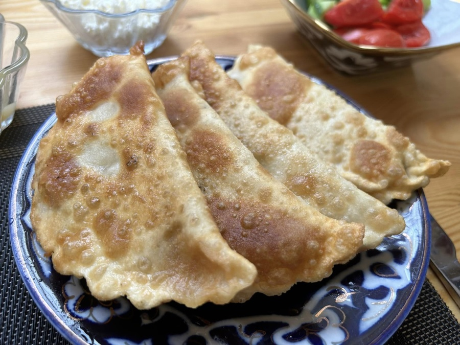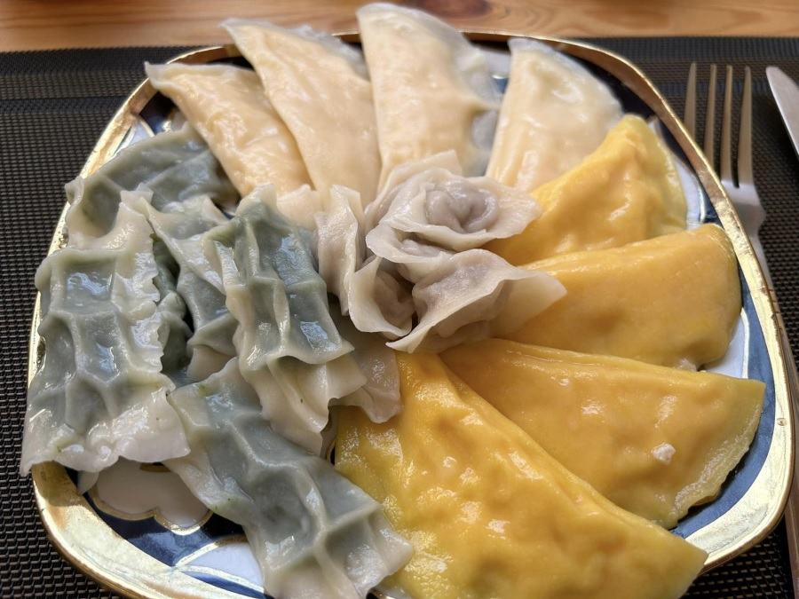 バラキュ、という蒸し餃子。4種あって、真ん中にあるのが肉、他のは、カボチャ、青菜、じゃがいも、だったと思う。