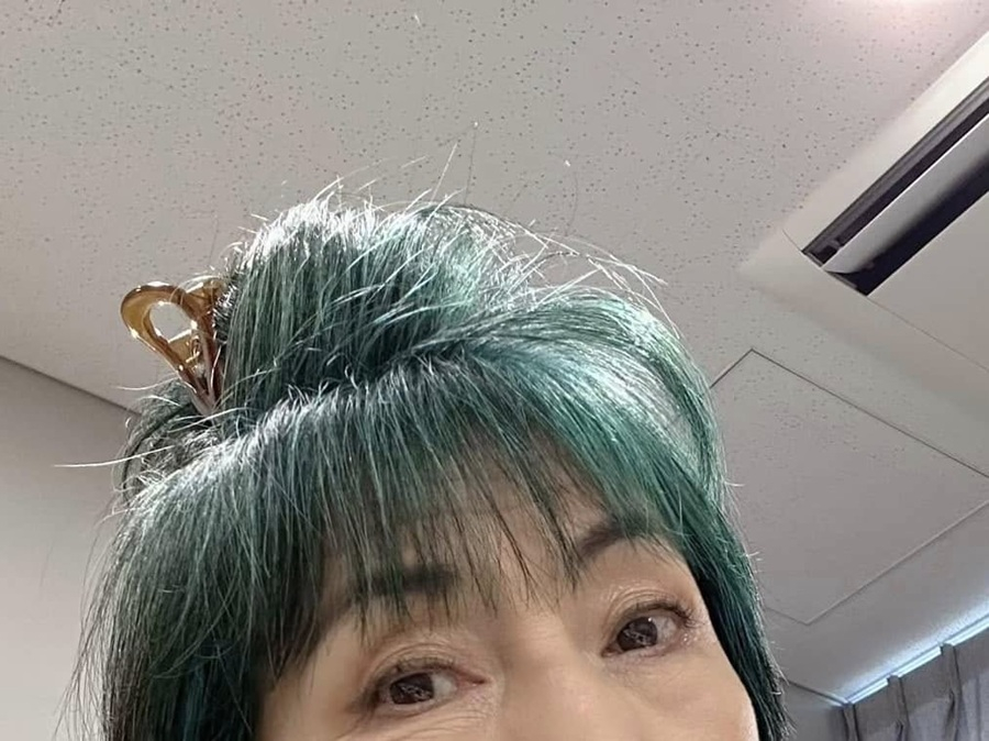 そうそう、青い薔薇の髪にしようと思ったのに残念。去年の黄色が残ってて緑になっちゃった。コスプレか?